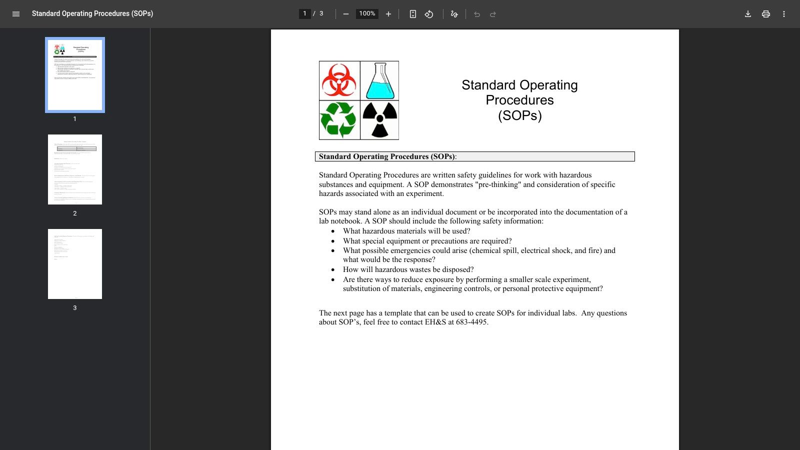 | Old Dominion Univ. EH&S | One‑page lab safety SOP: hazards, PPE, emergency steps | 👥 Labs, R&D, biotech & EH&S teams | ★★★★ Concise and compliance‑focused | ✨ Safety‑centric prompts for labs | 💰 Free PDF |