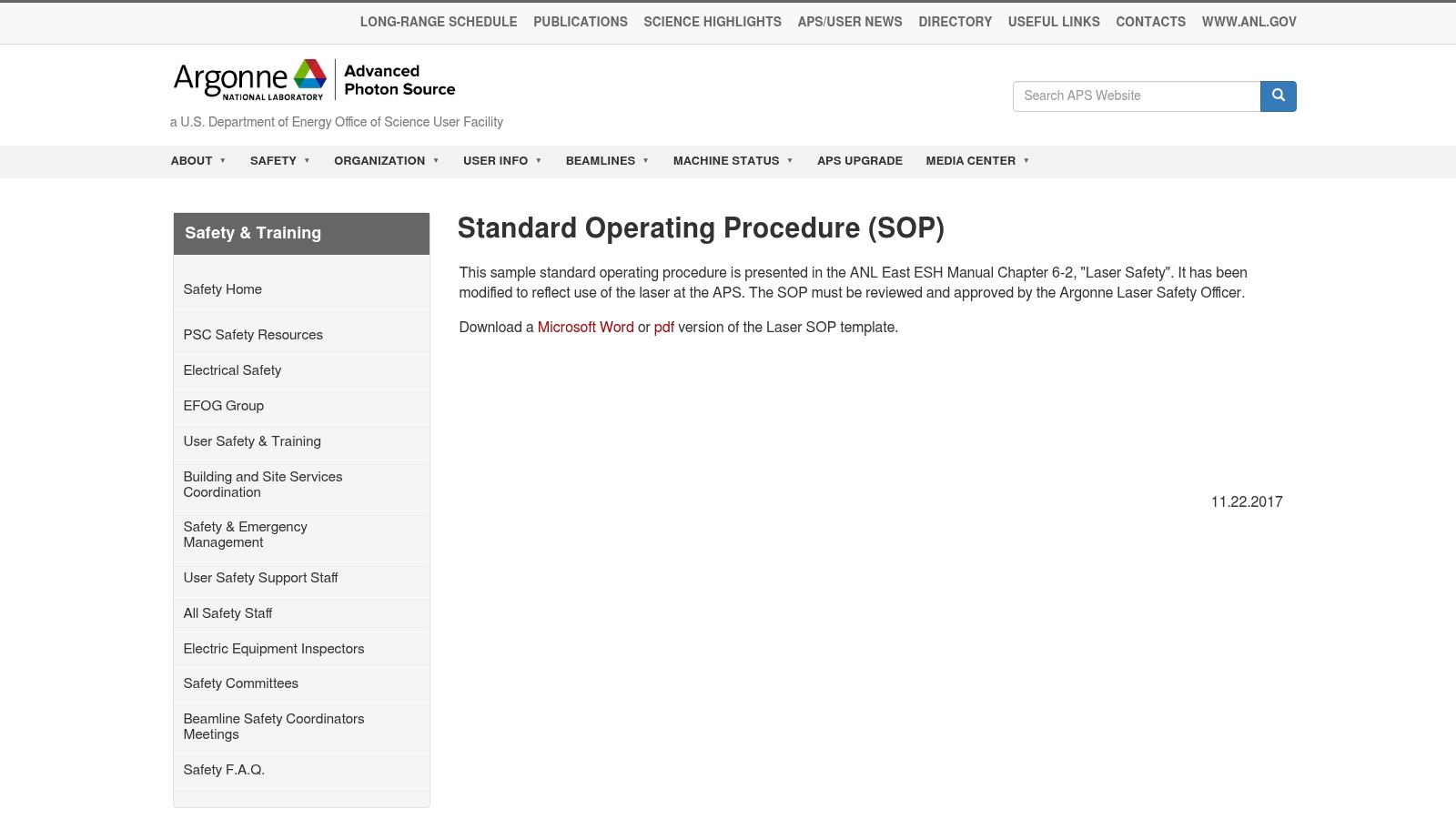 The Argonne National Laboratory Advanced Photon Source SOP page is laser-focused, but the structure is useful far beyond laser safety.