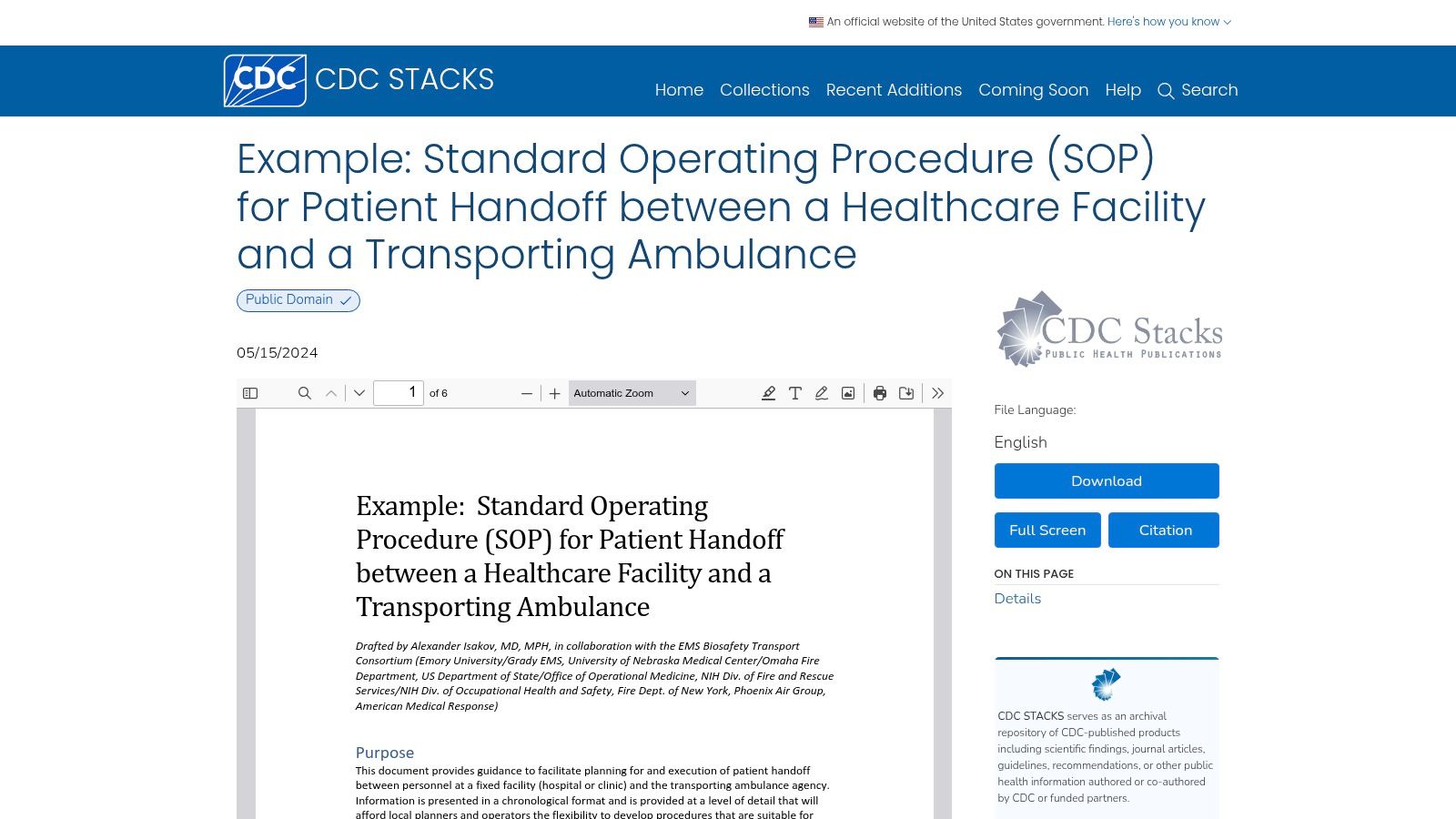 | CDC Stacks | Full, dated patient‑handoff SOP example with versioning | 👥 Healthcare & high‑risk handoff teams | ★★★★★ Real‑world, disciplined template | 🏆 Government‑standard handoff model | 💰 Free public‑domain PDF |