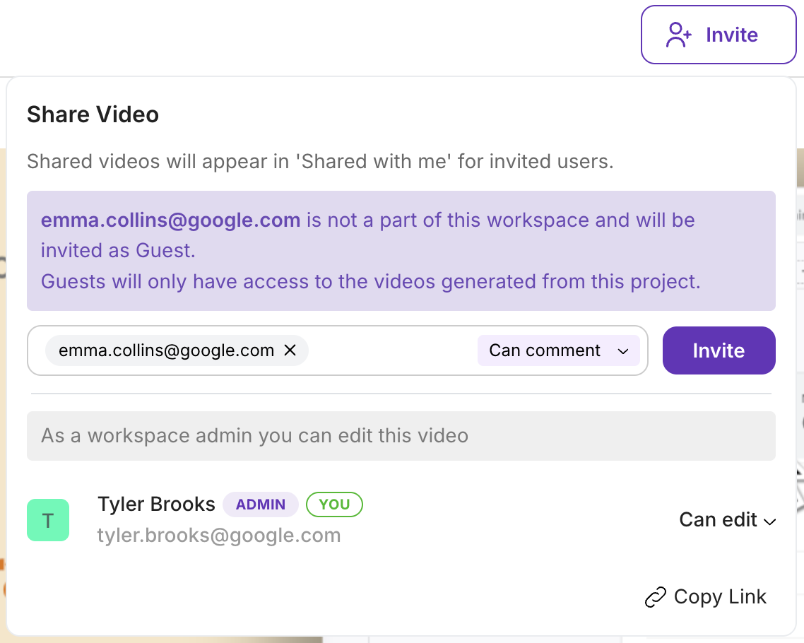 Section titled “Inviting colleagues”After generating a video, click the Invite button at the top of the video preview page. Enter email addresses to give colleagues access to view and comment.