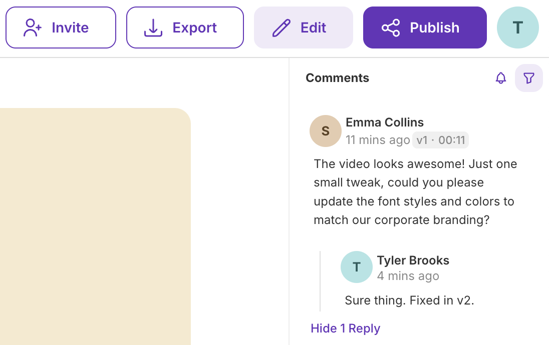 Comments turn your videos into collaborative review sessions. Teammates and guests can leave feedback tied to specific moments in the video, mention colleagues, and track discussions through to resolution.