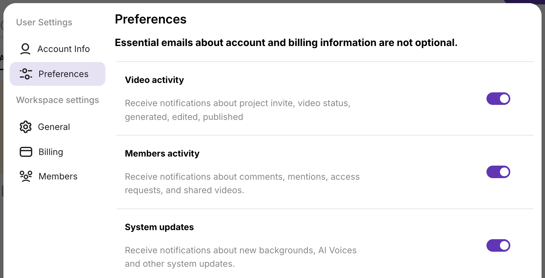 Section titled “Turning off notifications”For all projects: Go to Workspace Settings → Preferences and disable the Members activity toggle.