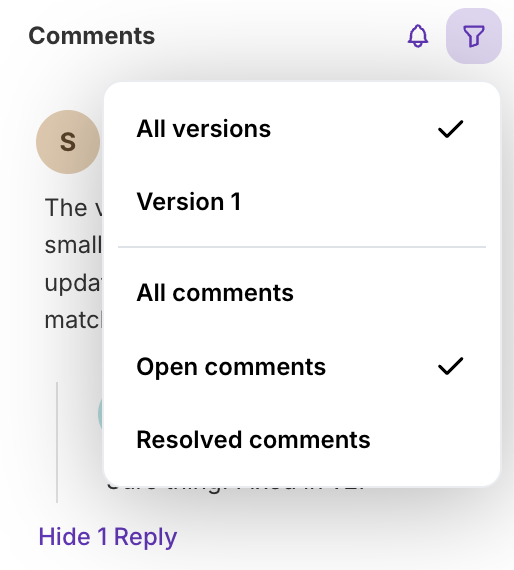 - Status — show open, resolved, or all comments