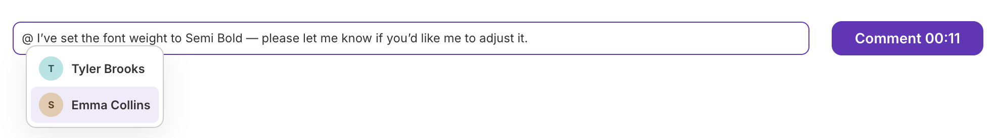 Section titled “Mentions”Use the @ symbol to mention colleagues in comments and replies. Mentioned users receive an email notification about the thread.
