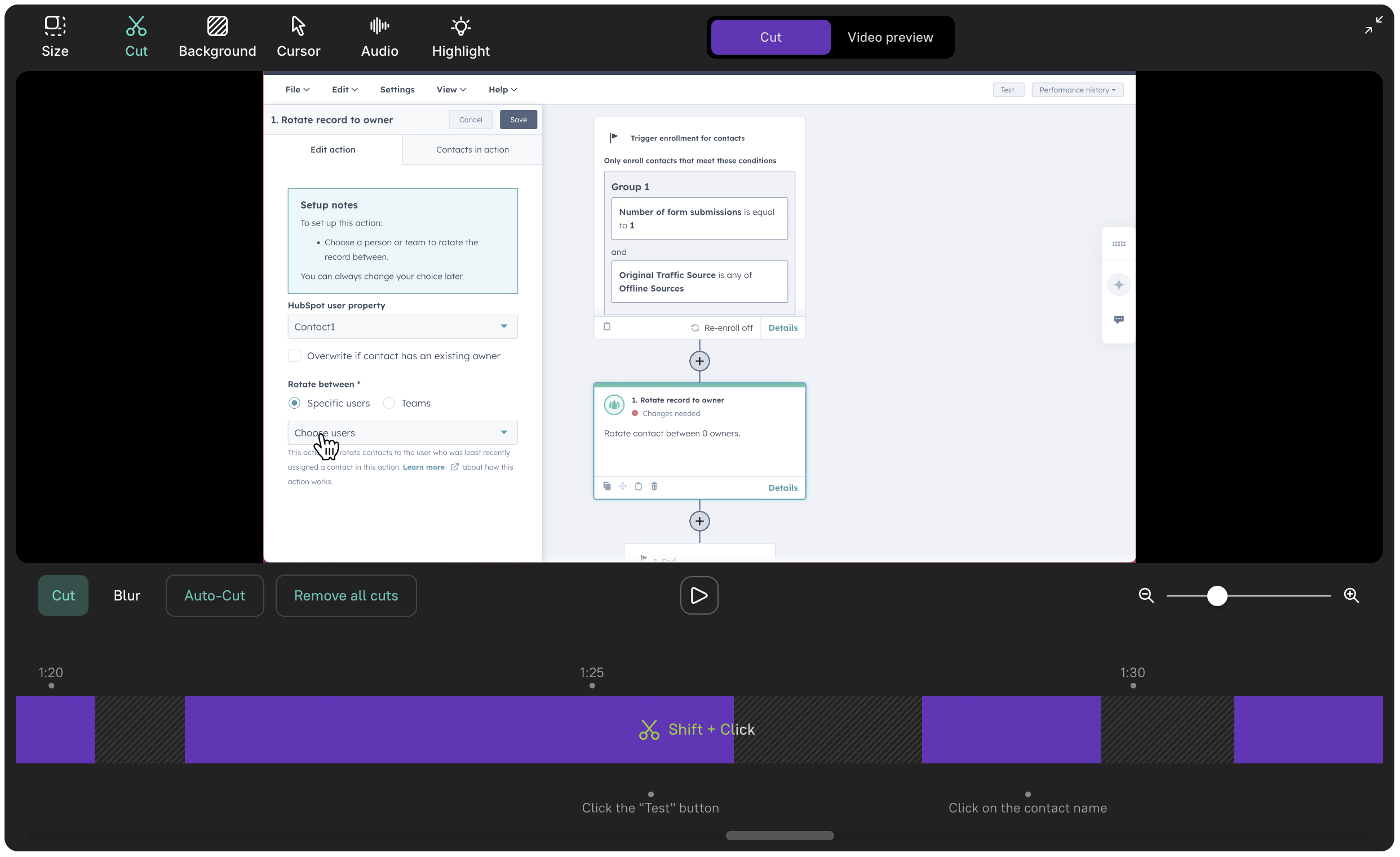 Mistakes happen during recording — pauses, wrong clicks, loading screens. The Cut Tool lets you remove unwanted sections without re-recording, and Smart Auto-Cut handles the most common issues automatically.