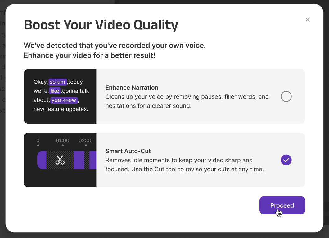 Smart Auto-Cut is enabled by default. It analyzes your recording and automatically: