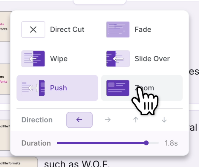 - Direction — Set to left, right, up, or down depending on how you want the new slide to enter