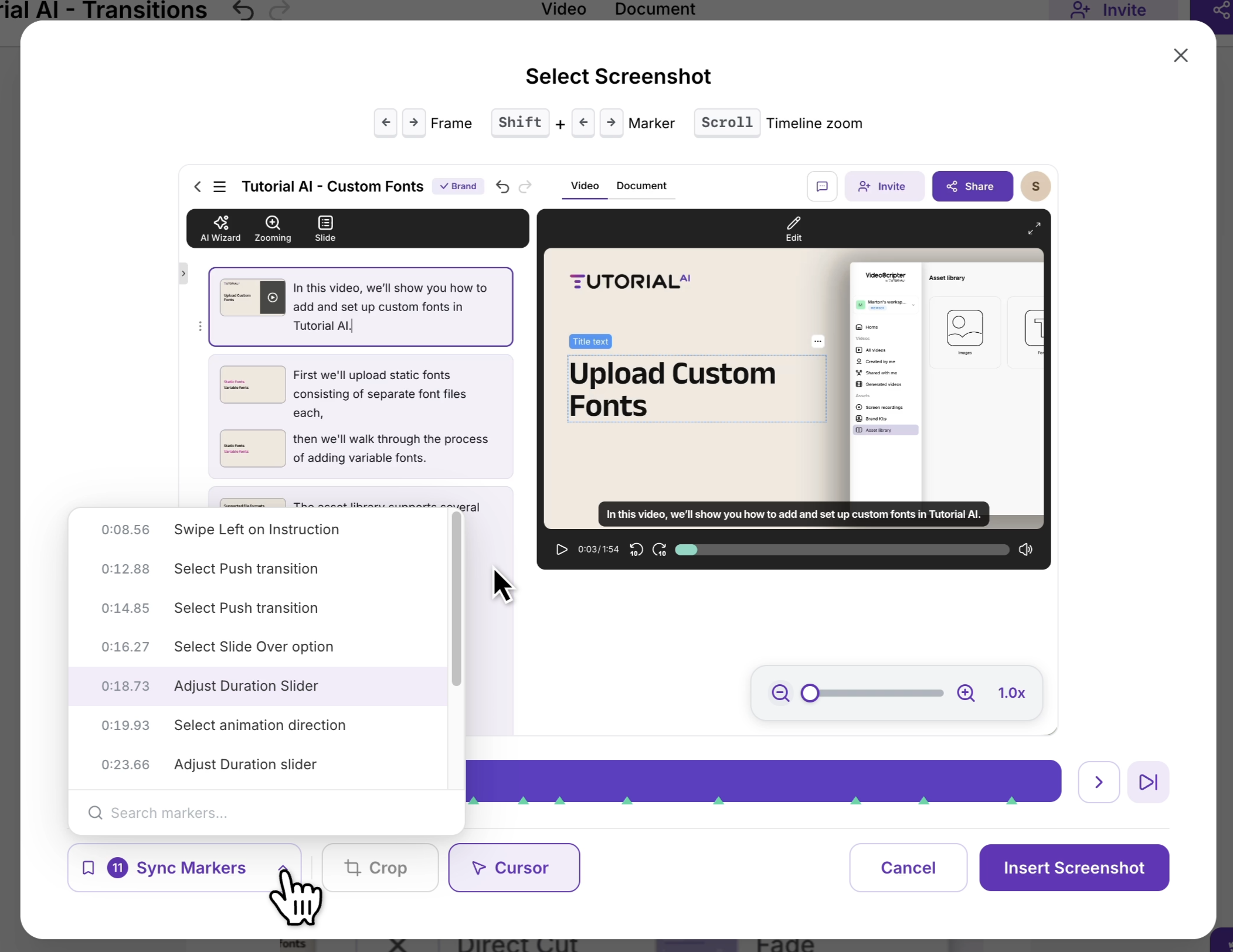 The selector highlights key events and Sync Markers along your video’s timeline, making it easy to find the right frame. You can also use the Crop Tool to focus on a specific area of the screenshot before inserting it.
