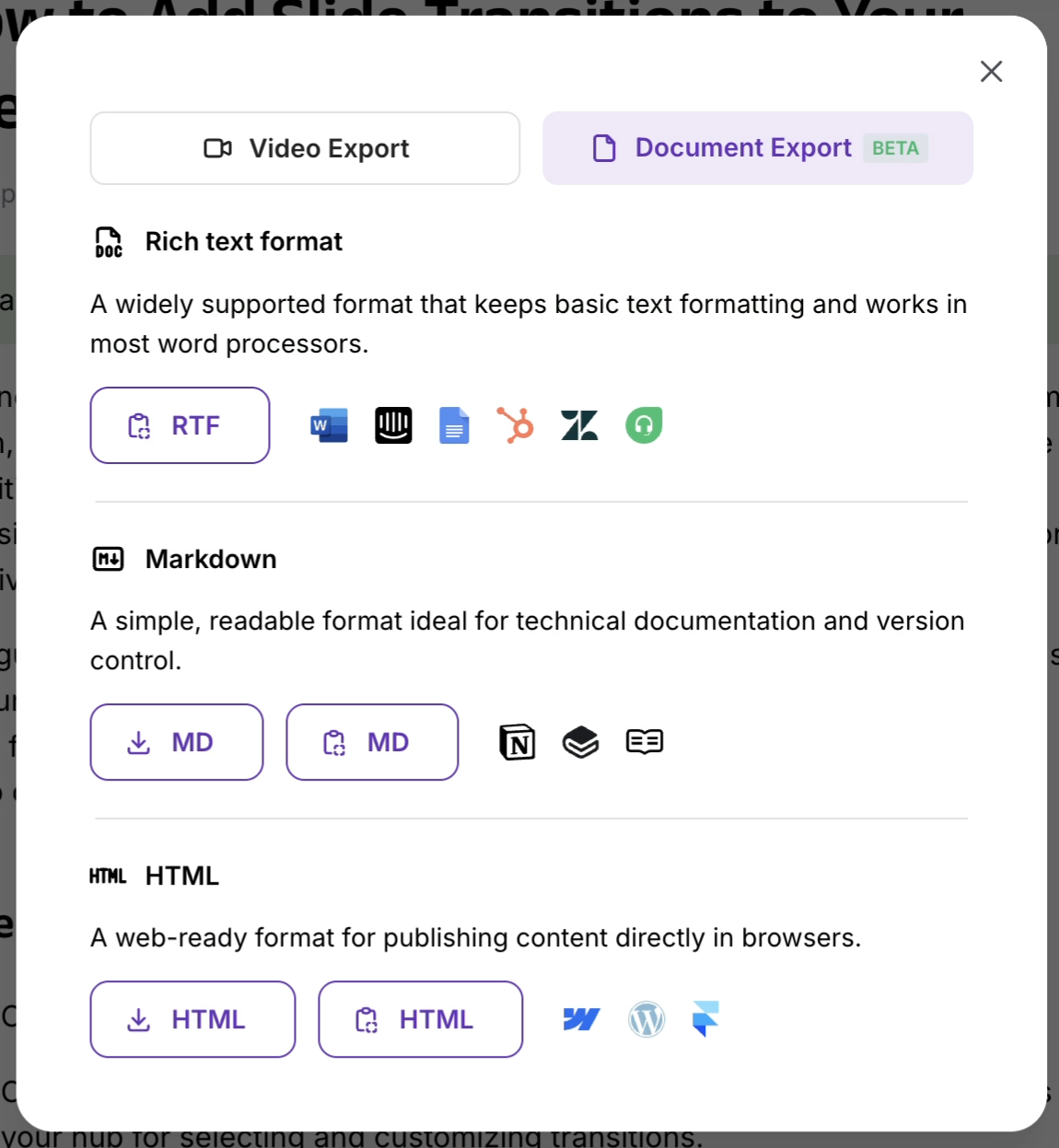 Once you’ve generated documentation from your video, export it in multiple formats for use in your knowledge base, CMS, or documentation platform.