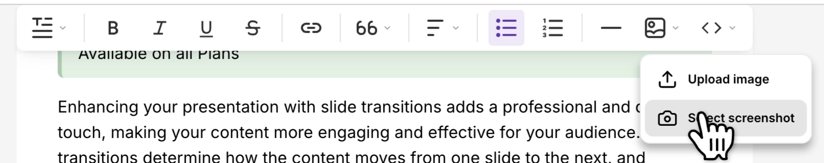 Section titled “Formatting and editing”Use the editor’s formatting tools to refine the generated article:
