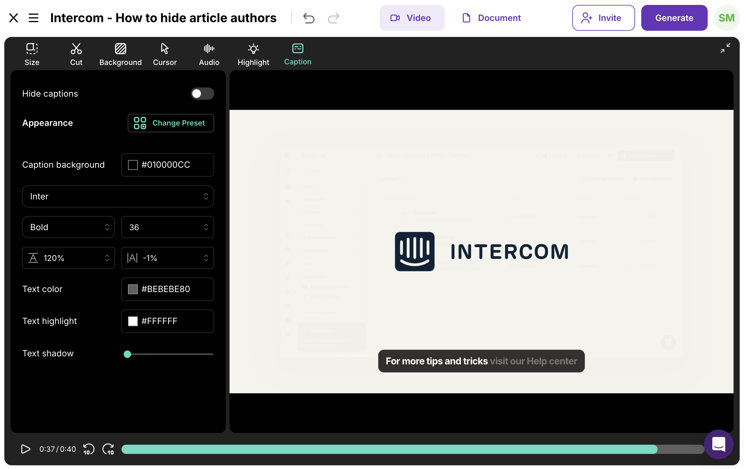 Open the Captions tab in the video toolbar and configure your caption styling — font, size, position, colors.
