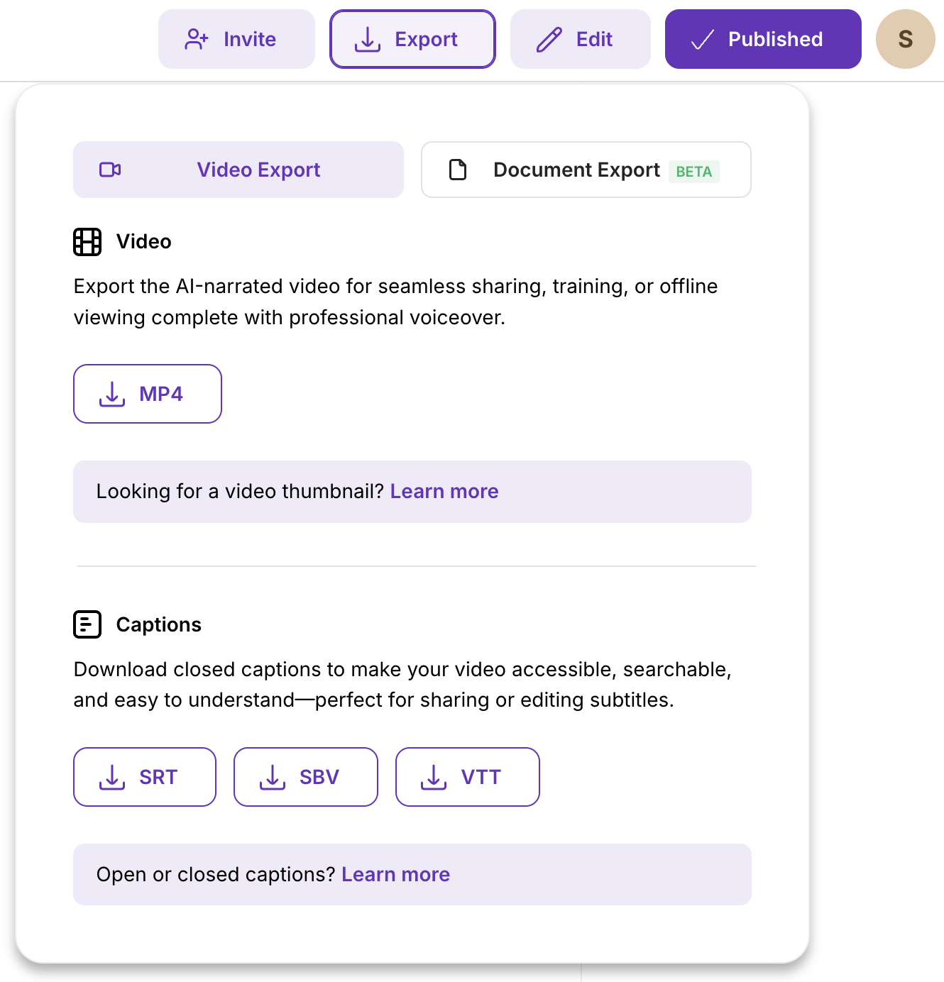 - Go to Export → download a caption file (.srt, .sbv, or .vtt)