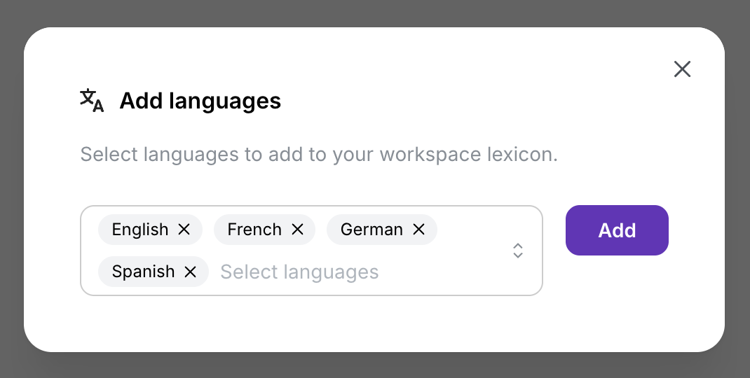 Section titled “Accessing the lexicon”Open the Pronunciation Lexicon panel on the left side of the interface and select Add Languages.