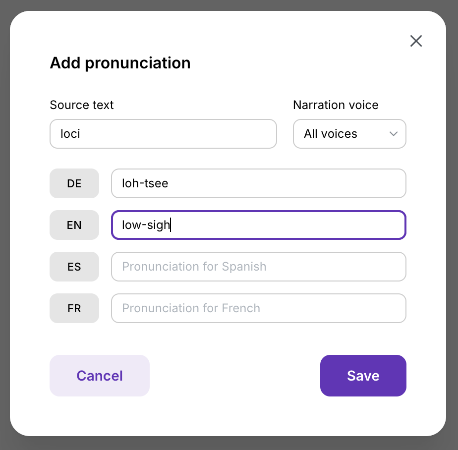 Section titled “Multi-language pronunciations”Add pronunciation entries for additional languages to ensure terms sound correct when you translate your video.