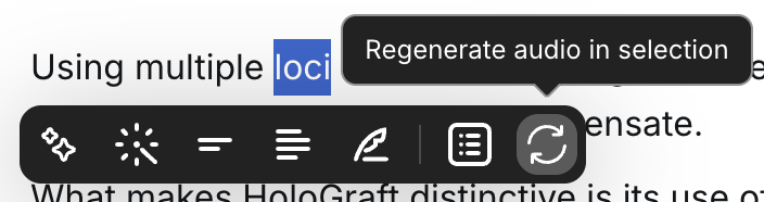 Section titled “Regenerating audio”Sometimes the AI voice mispronounces a word or generates an awkward-sounding sentence. You can fix this instantly by regenerating the audio for that specific sentence: